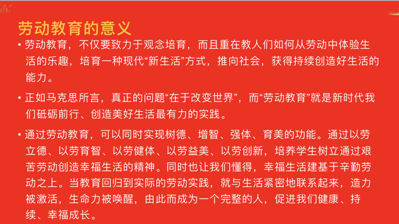 本次线上主题班会的顺利开展,有利于同学们更加深入的理解习近平总书记关于劳动教育的讲话精神,增强大学生热爱劳动的观念,做到崇尚劳动、热爱劳动、尊重劳动。同时,本次活动有利于营造良好的劳动教育氛围,为培养积极向上、全面发展的翻译学子奠定了坚实的基础。