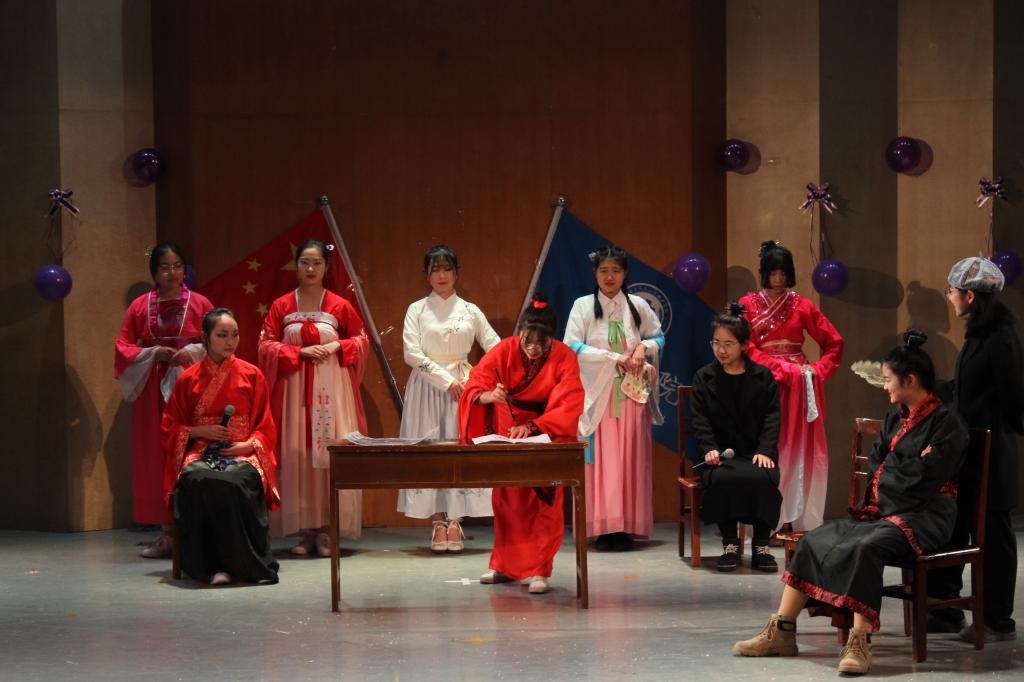 晚会分为"我的新时代"、"我的新使命"、"我的新征程"、"永远在路上"四个篇章。伴随着富有青春活力的舞蹈,晚会拉开了序幕。歌曲《我和我的祖国》高亢激昂,唱出了当代青年的拳拳爱国心;合唱《相亲相爱》点燃了晚会的气氛,引得观众连声叫好;魔术表演《幻影移位》神秘有趣,带领译院学子体会魔幻世界;卢正爱老师的舞蹈《喜悦》温婉优雅,展现了朝鲜传统文化的魅力;包芳老师等人带来的日语歌舞串烧《樱花飞舞时》唱出了独具一格的日本柔情,将气氛推向高潮;研究生带来的《全国第一套研究生广播体操》活力四射,将译院学子的朝气展现得淋漓尽致。小品、魔术、歌舞……各种表演形式别出心裁、异彩纷呈,整场晚会精彩不断、高潮迭起,为台下观众呈上了丰盛的视听盛宴。最后,晚会在歌曲《good time》中落下帷幕。
