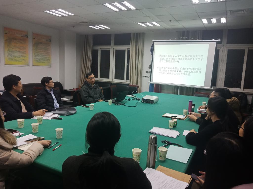 晚上的专题报告会,王教授结合自己成功申报多项国家社会科学基金项目的体会,对国家社科基金申报的意义与类型、管理与服务、论证与设计等进行了缜密细致的专题讲解。对中青年教师在积极参与国家社科基金项目申报过程中明确研究方向,树立学术目标,融入学术团队,夯实学术素养,学会担当责任,不断提高自身的学术能力与科研水平等提出了明确的要求;并且从科研项目选题、前期成果的凝炼、课题设计论证、研究内容、思路方法、研究基础和条件保障等方面进行了深入的阐释。