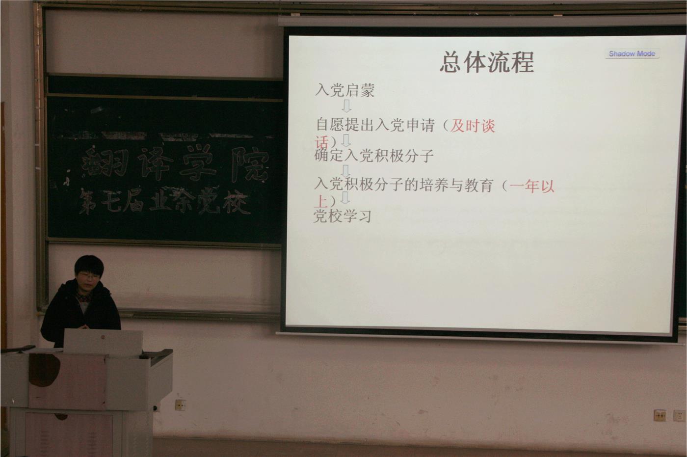 首先,王永力就党的基本知识和性质、行动指南、基本路线根本宗旨以及入党的条件等为在场同学进行了详细的讲解,并向大家介绍了八个党员必须履行的义务以及十八大新旧党章对比等知识。随后,张正旭上台就学生党支部的情况加以介绍,传达两会精神,并为同学们总结了习近平总书记和李克强总理的精彩语录。走近课堂,不时传来讲师们严谨而幽默风趣的讲课声和高亢优美的红歌声。最后,贾晓丽向大家展示了入党的基本流程,并就入党申请书的基本格式、注意事项以及递交申请书以后思想汇报的正文内容等予以解说。三位党员的精彩讲授深深地感染了每位同学,教室里不时响起热烈的掌声。