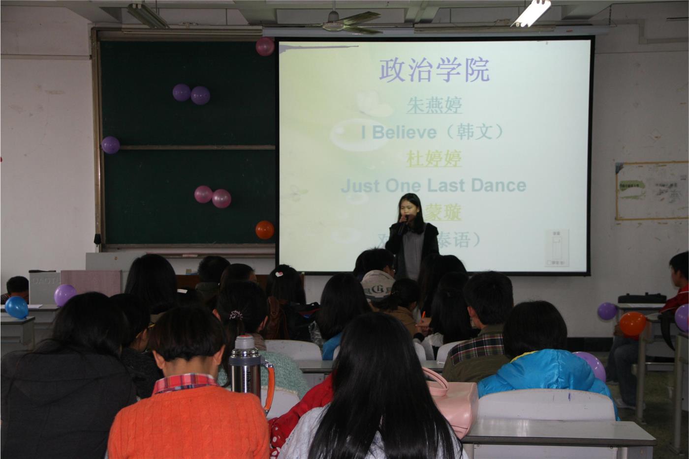 的张琳琳同学就以一首轻柔舒缓的英文歌< >沸腾全场;随后,更有来自政治学院的选手带来的韩语歌< >等精彩表演。其他学院的选手也都依次上台演唱,场下一阵阵掌声、欢呼声将比赛逐渐推向高潮。最后,来自番号鸽