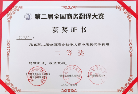 本届大赛由全国翻译专业学位研究生教育指导委员会、中国中外语言文化比较学会、上海市外文学会、上海市科技翻译学会、上海对外经贸大学主办,上海对外经贸大学国际商务外语学院承办。大赛分为“英译汉”与“汉译英”两个组别,各设特等奖1名、设立一等奖3人、二等奖6人、三等奖10人及优胜奖等类别。本次大赛分为初赛和决赛两个环节,内容涵盖了贸易合同、股票投资、电子商务等商务翻译领域的主要内容。刘文江同学经过初赛线上翻译的选拔,成功晋级决赛,并在决赛中沉着应对、冷静答题,凭借扎实的语言功底获得了全国二等奖的良好成绩。