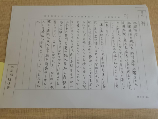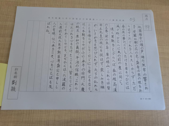 初赛中,同学们积极上交纸质书法作品。书法作品由日语协会评委老师评分遴选并在参赛群内公布决赛入围名单。参加决赛选手统一抄写由指导老师精心挑选的日语美文,使用统一发放的书写纸进行书写。最后,决赛书法作品交由评委老师进行评选。经过评选,获奖情况如下。