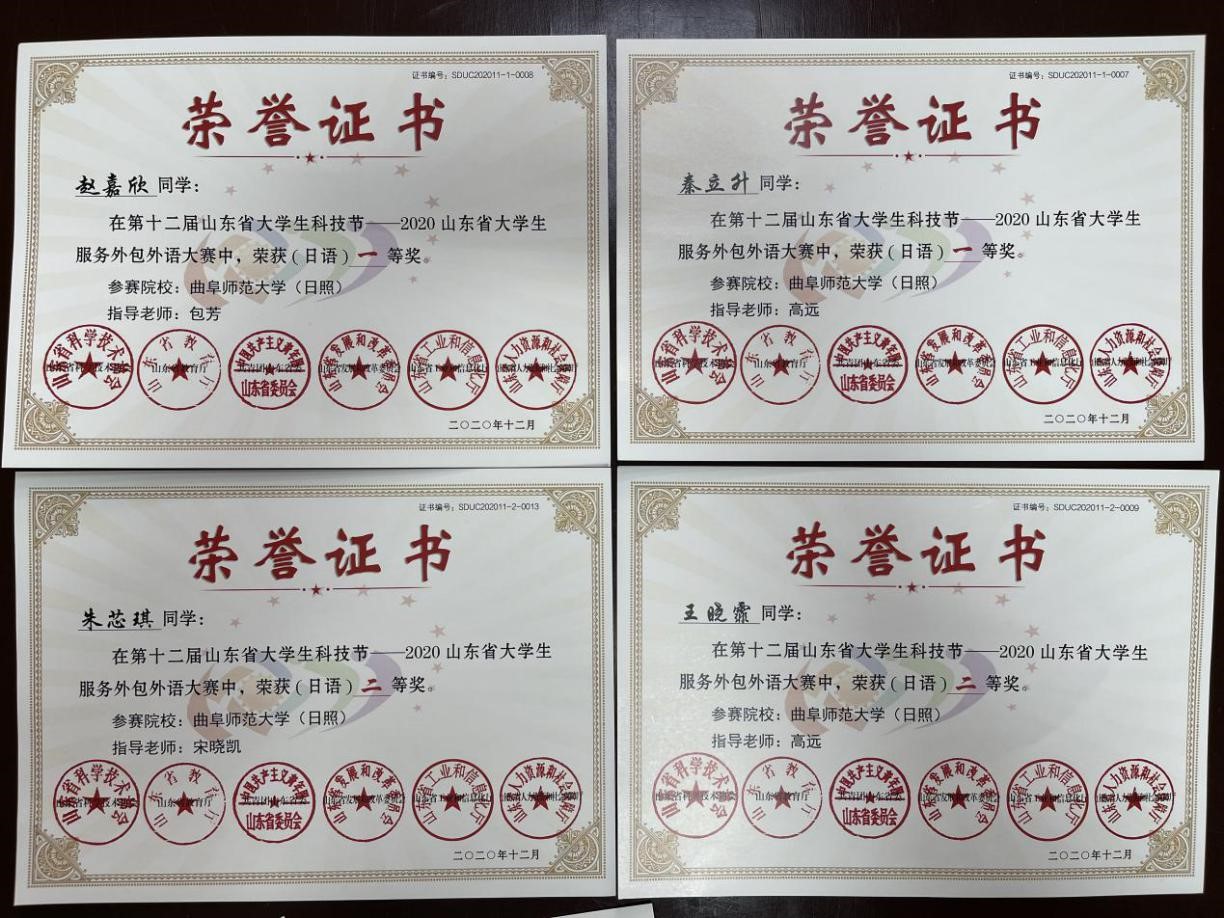 日语专业和朝鲜语专业十一名学生参赛并取得优异成绩,其中,日语专业秦立升、赵嘉欣荣获一等奖,日语专业朱芯琪、赵晓霏获得二等奖,日语专业高雨葭、李鑫玥、李洁、张瑞雪、张艳秋、张力月和朝鲜语专业韩雅迪获得三等奖。此外,包芳、徐凤、宋晓凯、高远四位教师荣获“优秀指导教师”奖项,番号鸽