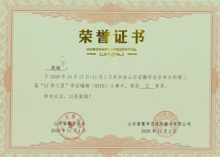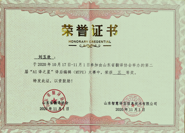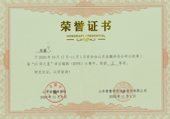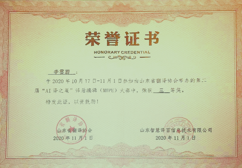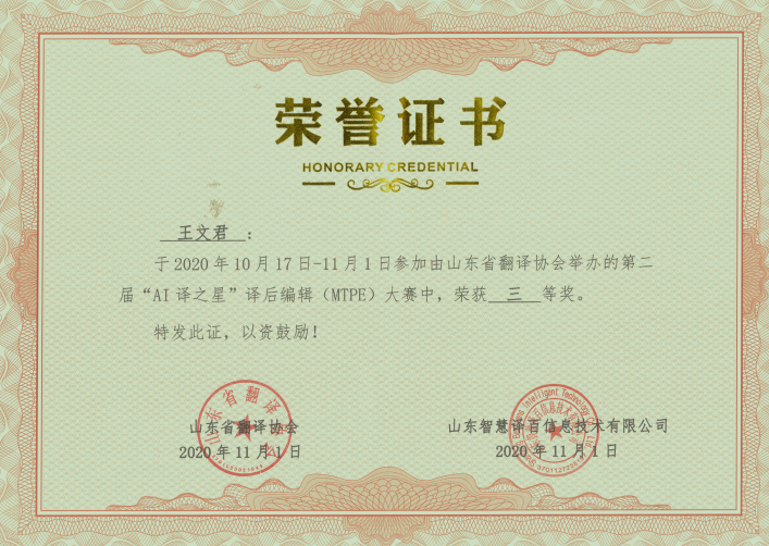 2020年11月1日,山东省第二届“AI译之星”译后编辑(MTPE)大赛比赛结果揭晓,来自番号鸽