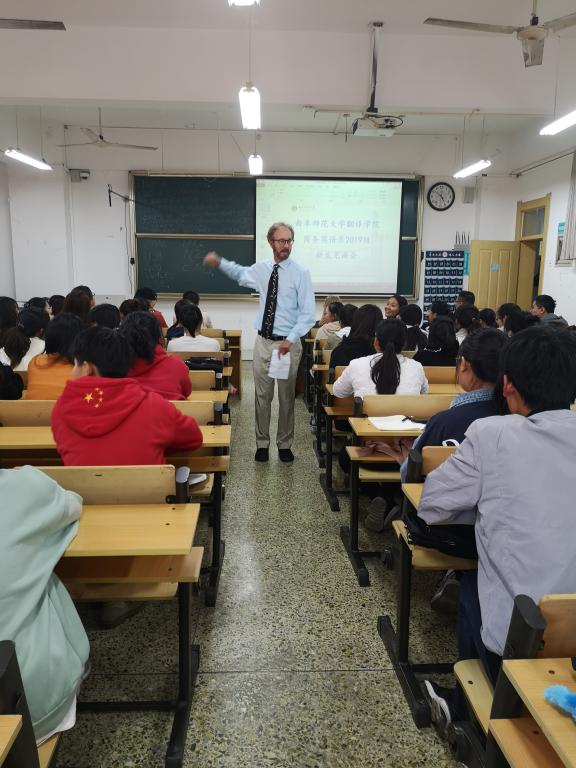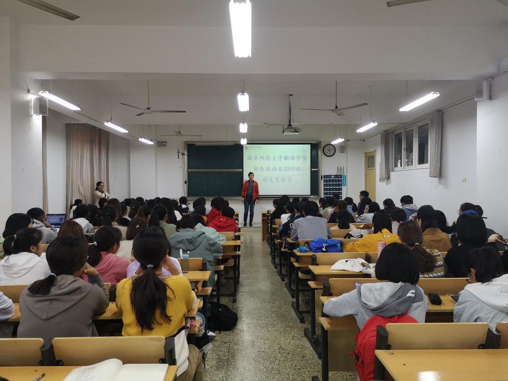 商务英语系2019级新生专业推介会在JC304举行,副院长夏云教授、山东省海外特聘泰山学者刘新新教授、商务英语系专业顾问伊咏教授、系主任刘瑶博士、外教Katie和Danel以及商务英语系的全体教师参加本次推介会,系主任刘瑶主持本次会议。
