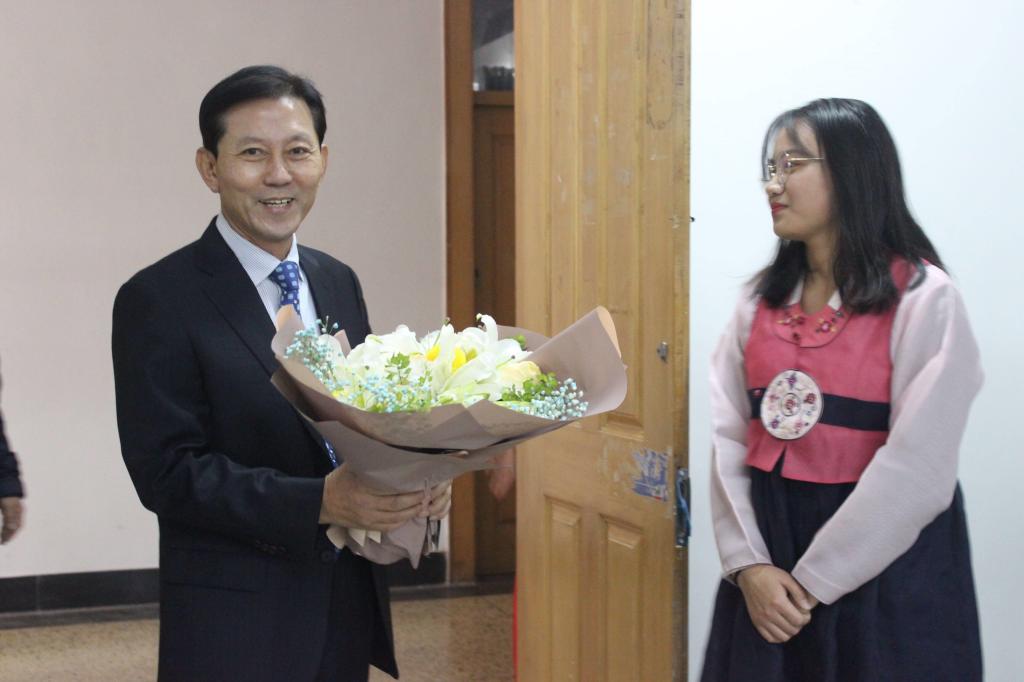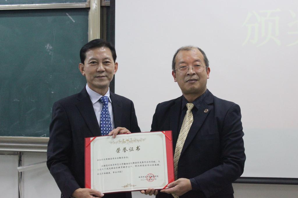 的发展有很大的帮助,也对学院的学生有很大的帮助,全翰圭会长不仅用语言,还用实际行动为中韩文化交流,为朝鲜语系的发展做出了巨大的贡献。接着,党委副书记董家忠为全翰圭会长颁发荣誉证书,全翰圭会长为本次获得奖学金的同学颁发荣誉证书,对获得奖学金的各位同学表示祝贺并加以鼓励。最后,全翰圭会长、金东国教授、董家忠书记与老师们和获奖同学合影留念,至此,本次颁奖仪式圆满结束。