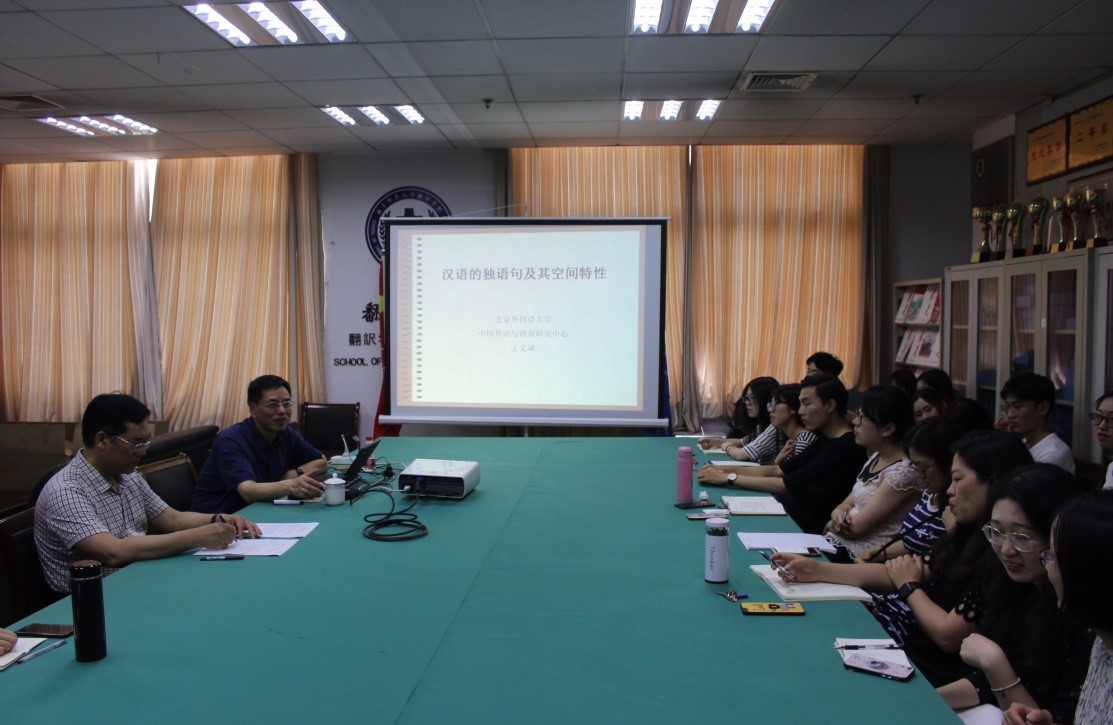 6月21日下午,北京外国语大学教育部人文社科研究基地“中国外语教育与研究中心”主任、博士生导师王文斌教授为我院师生做了题为“汉语的独语句及其空间特性”的学术报告。报告由院长卢卫中教授主持,李德高教授、周统权教授、夏云教授等部分教师、研究生和本科生聆听了本次报告。