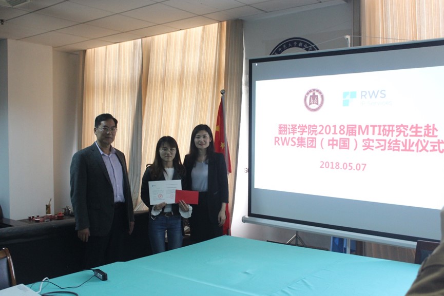 2018届MTI研究生赴RWS集团中国公司实习结业仪式在学院801会议室隆重举行。RWS集团中国公司郑金凤副总经理、日语部姜宁经理、WIPO部王蒙总监、行政助理李捷、学院卢卫中院长、夏云副院长出席了此次活动,学院2016级、2017级全体MTI研究生参加了此次活动。结业仪式由MTI中心主任许家绍主持。