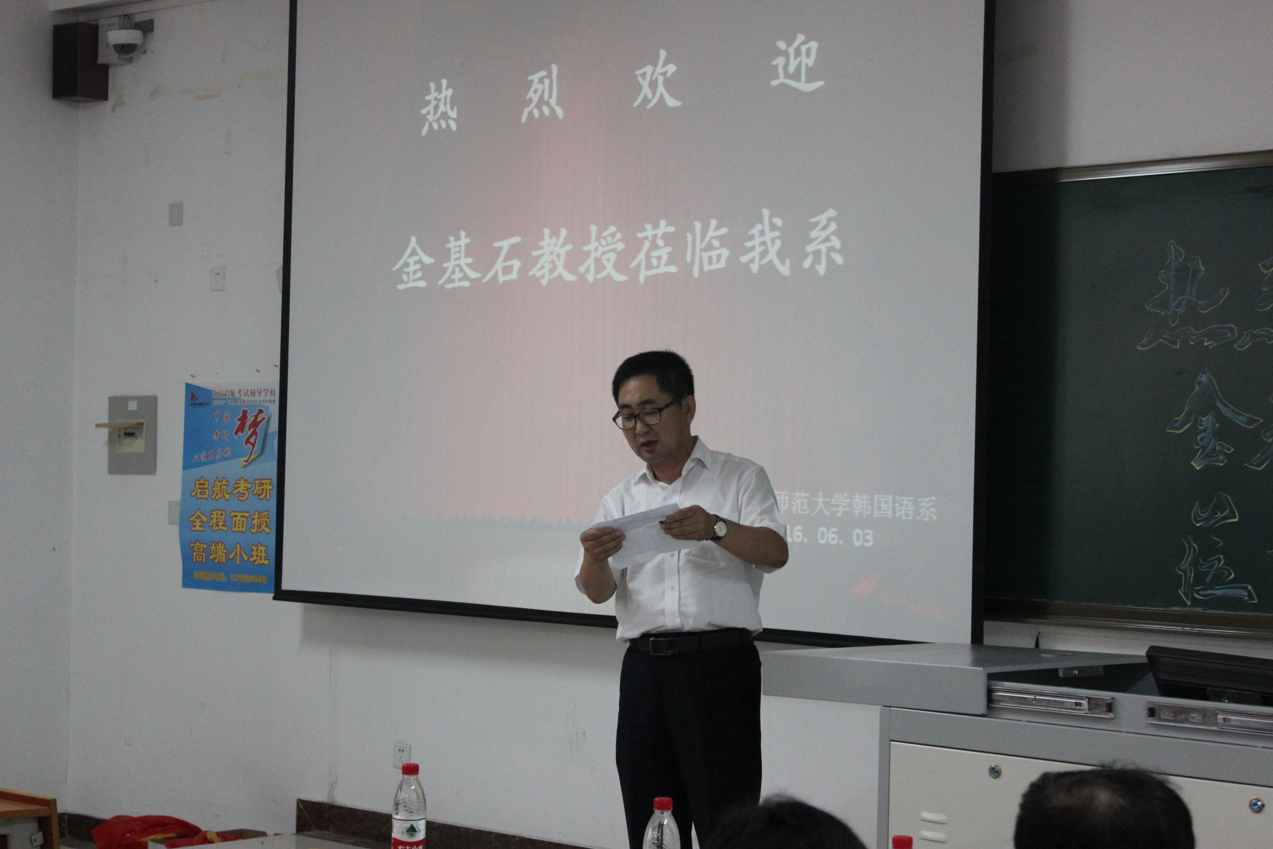 韩语系举办的“中韩文化语言比较”讲座在s楼107教室举行,上海外国语大学博士生导师金基石教授担任本次讲座的主讲人。讲座由韩语系主任金东国副教授主持,韩语系全体师生聆听了本次讲座。