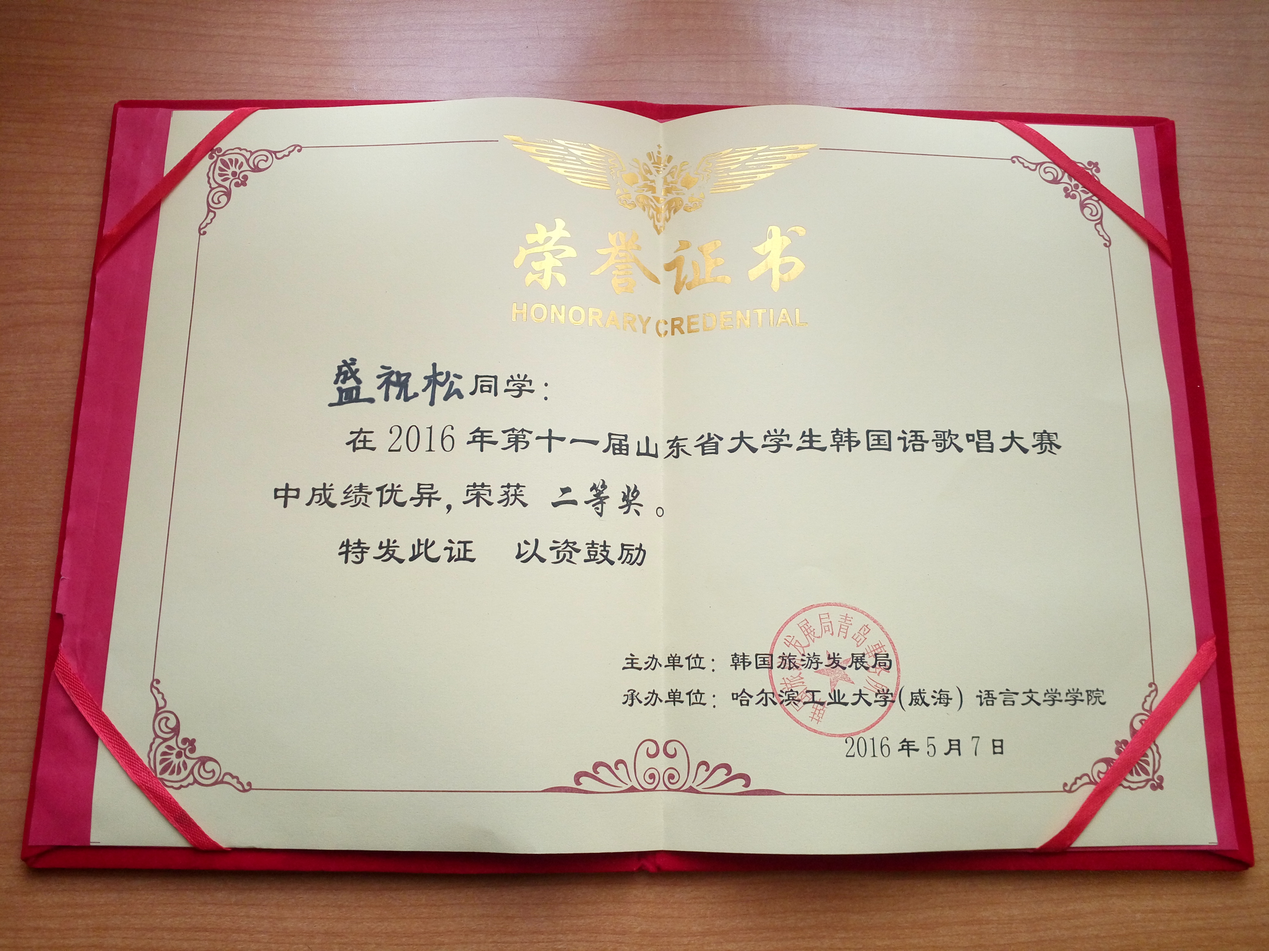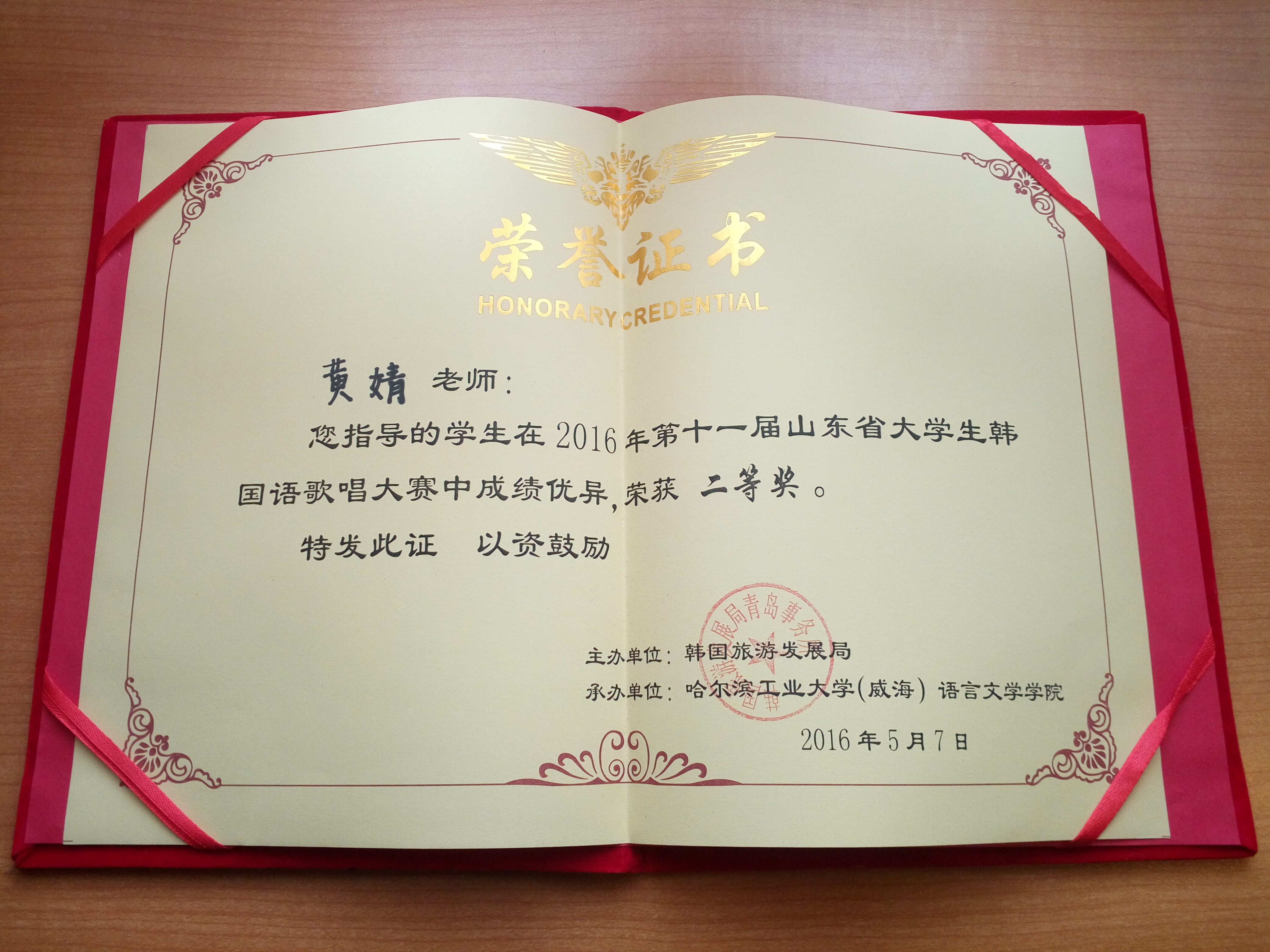 2014级韩国语专业盛祝松同学以一曲经典的《난 아직 모르잖아요》赢得了现场观众的热烈掌声和评委们的一致认可,最终荣获大赛二等奖。指导教师黄婧获优秀指导教师奖。师生均获得免费赴韩文化体验的机会。