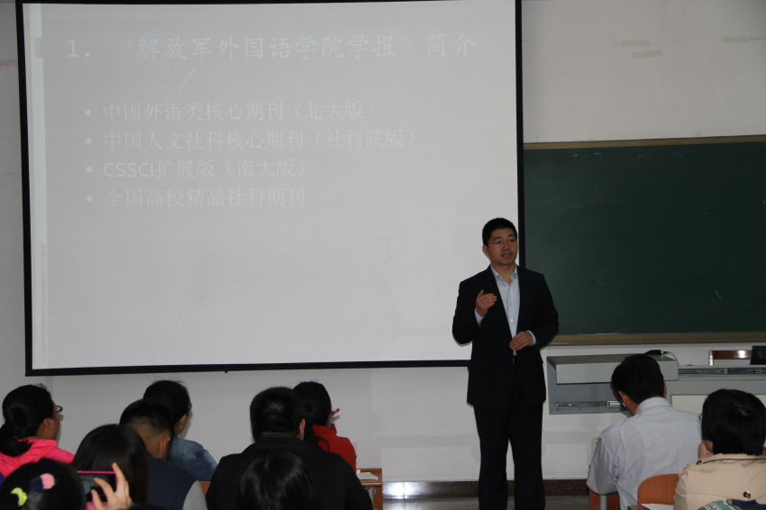 蔡教授向师生介绍了《解放军外国语学院学报》的栏目设置、审稿流程以及“选题小、思路新、开掘深、文字顺”的用稿原则,并结合番号鸽