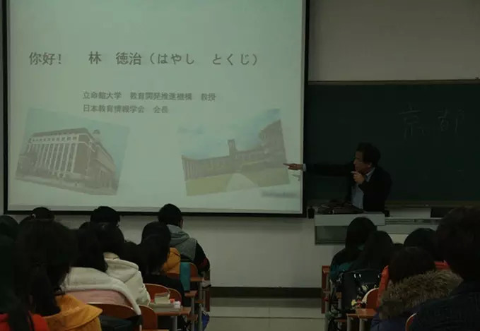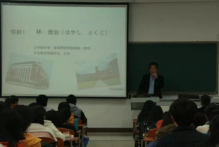 s107教室拉开帷幕。日本立命馆大学教授、日本教育情报学会会长林德治先生莅临指导,担任本次讲座的主讲人。我院13、14级日语专业全体学生参加了此次讲座。