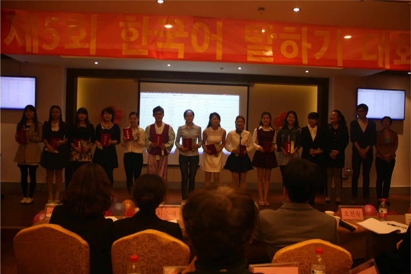 本次大赛共有22名选手参加,参赛者须进行演讲及接受评委现场问答两个环节。评委团将从选手的主题内容、演讲能力、即兴问答规定时间和观众反应进行评分。比赛伊始,科研副院长夏云、韩国语系主任金东国依次致辞,评委团代表为选手及观众宣读比赛规则。据介绍,今年是大赛的第五届,不仅参赛规模发展,内容也更加丰富。比赛中,参加本次韩国语演讲大赛的选手他们以新颖的演讲主题、流畅的表达、丰富的表现形式赢得了现场观众的阵阵掌声。经过激烈角逐,郭继梁获同学喜获一等奖,白廷菲、刘晓琳、赵凯悦获得二等奖,王粟等获得三等奖,12名同学获得优秀奖。比赛最后评委团代表总结赛况并致辞,金东国教授为五位评委颁发了奖品及证书,至此大赛圆满结束。