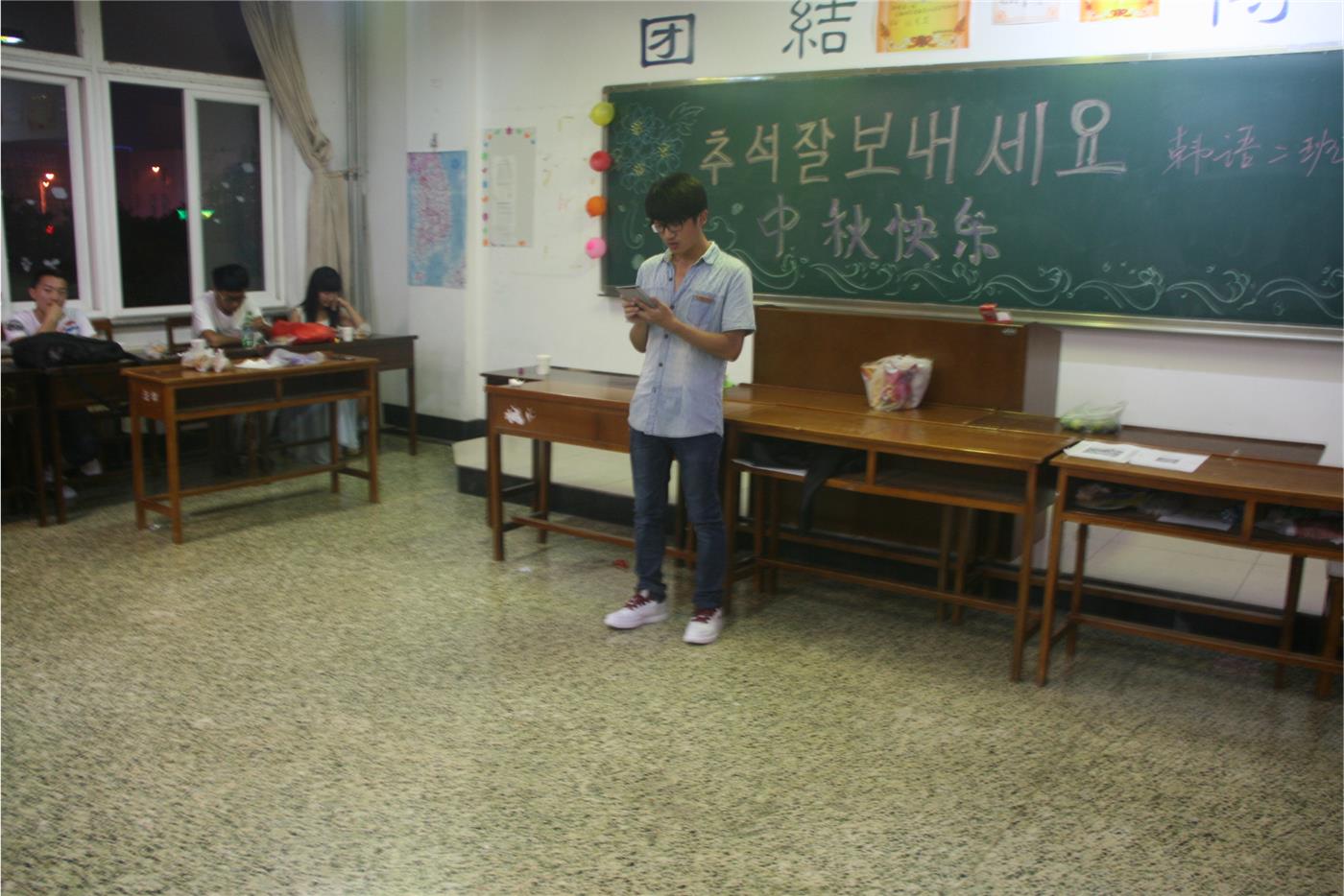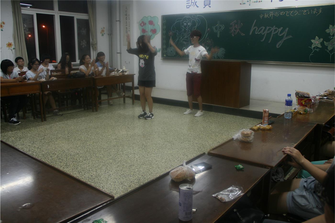 首先,主席团代表到各班去参观问候,带去中秋的祝福。各部部长及副部们分别负责几个班级,与新生一起度过本次中秋晚会。各班晚会过程精彩纷呈、亮点不断,大家在欣赏节目的同时也感受到了集体的温暖。晚会上,有的班级玩起了“海盗船长”的游戏,使同学们在互动中友情升温。有的班级成语接龙,在增长知识的同时又调动了气氛。幽默搞笑的脱口秀表演,风格独特的吉他弹奏赢得了同学们的阵阵掌声。贯穿其中的舞蹈串场和独唱表演以及原创歌曲都让同学们赞不绝口。