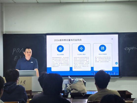 会议伊始,岳峰结合就业市场动态与外语专业属性,深度剖析就业态势与行业政策,系统梳理了外语人才在跨境电商、政务翻译、国际交流等领域的需求,细致解读了国家及地方就业帮扶细则,同时借助往届毕业生“专业对口求职”与“跨领域发展”的真实案例,引导学生建立理性就业预期,鼓励其锚定专业优势、打破思维局限,拓宽职业路径。