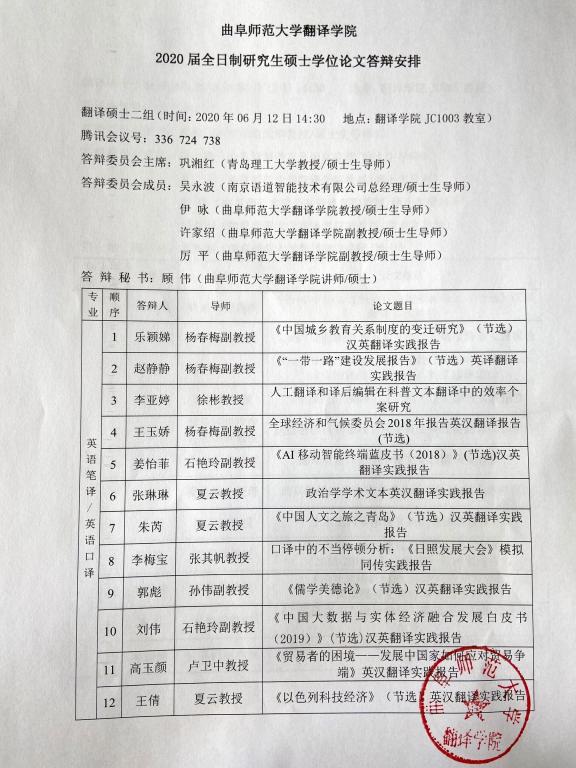 番号鸽 2020届全日制研究生硕士学位论文答辩安排1