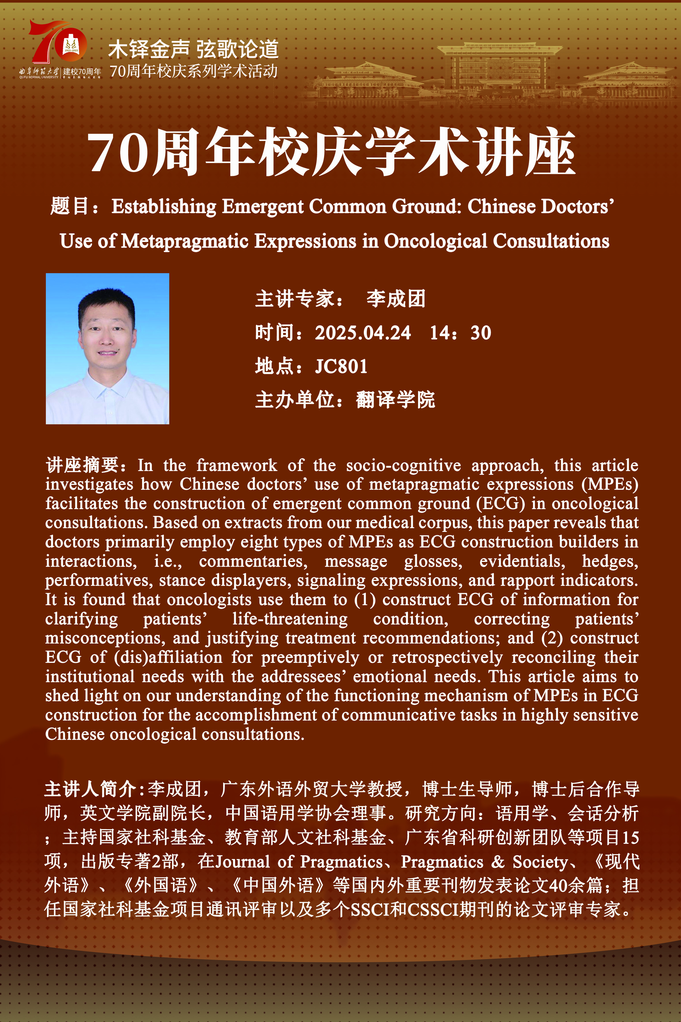 李成团教授专家讲座:Establishing Emergent Common Ground: Chinese Doctors Use of Metapragmatic Expressions in Oncological Consultations